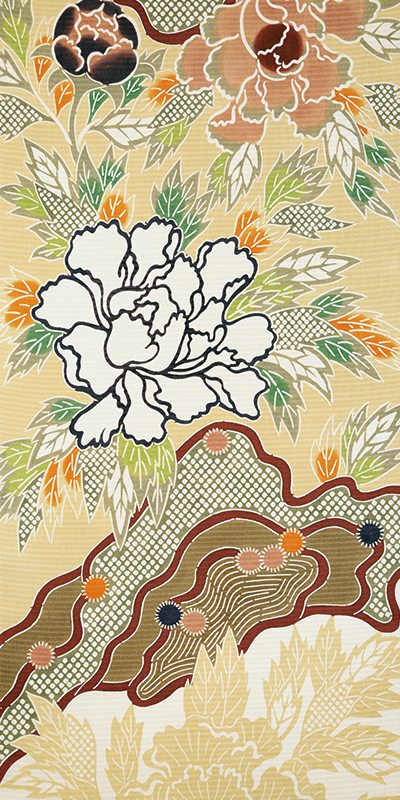 またパスポートの必要な時代の沖縄にも何度かスケッチ旅行で訪れたそうで、その時に出会った琉球紅型に心奪われた吉三郎氏、紅型三宗家のうちの一軒、城間栄喜氏との親交を深めていきました。琉球紅型はいわゆる琉球王族の衣裳ですので、ふわりと羽織る衣裳は顔料で染められていました。一方で京友禅は染料で染められています。和装に参入したばかりの城間氏との交流や、京友禅に携わる地元の知人たちとの親交で、琉球王族の衣装「琉装」の紅型を、染料で染めてみたり、色柄を変えてみたりと試行錯誤を続けながら、和装紅型、通称「栗山紅型」を生み出しました。