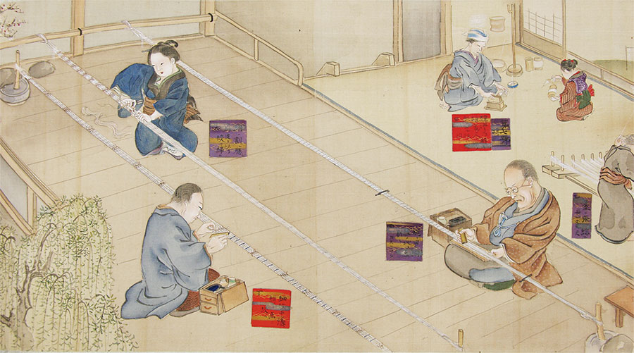 帰山雲涯によって描かれた『縮布製造之真図』(小千谷市文化財)の抜粋。この巻物には小千谷の四季折々の風景、明治初期の風俗とともに、小千谷縮の詳細な工程が描かれています。