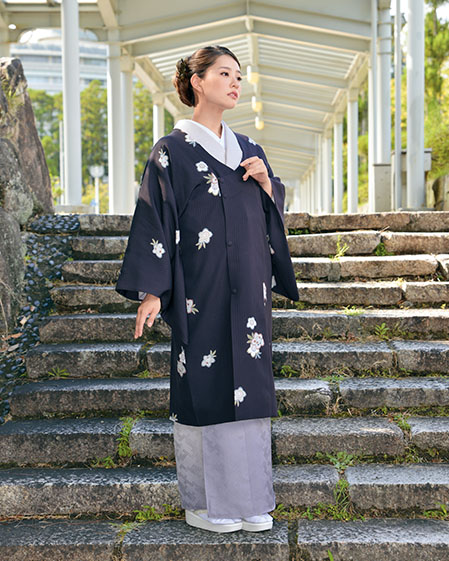 直線の多い着物の装いの中で、衿元のゆるやかな曲線はことさら華やかさと⼥性らしさを醸します。スナップで留めるタイプですので、体形の変化が少ない⼈ならば⻑く愛⽤することができるでしょう。着物で着るには少し派⼿と思えるような⼩紋でもコートになるとまた味わいが変わります。